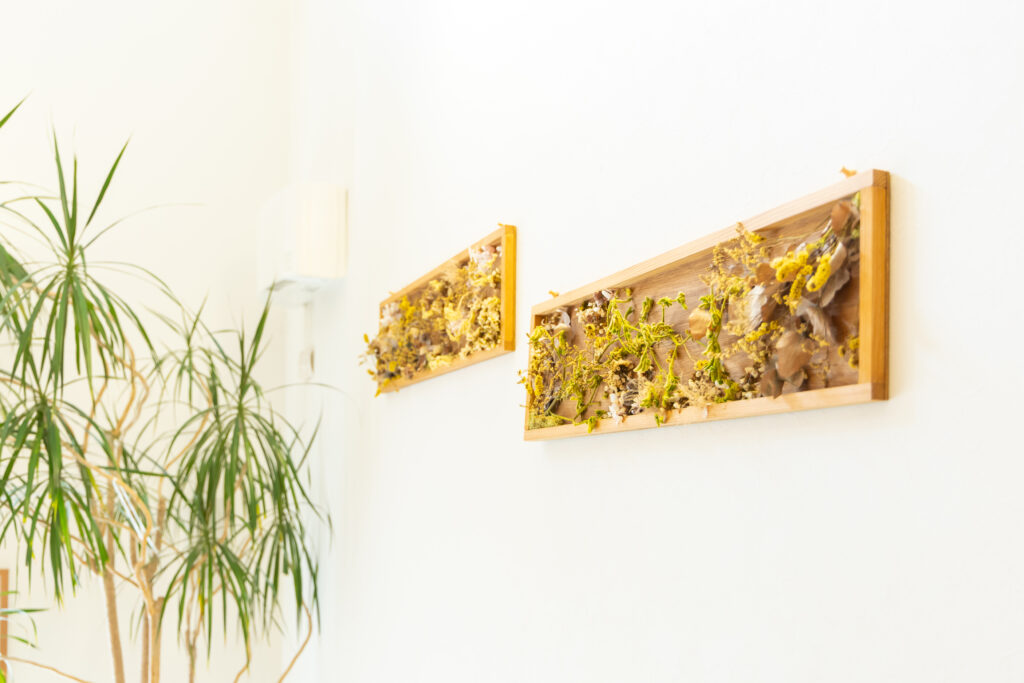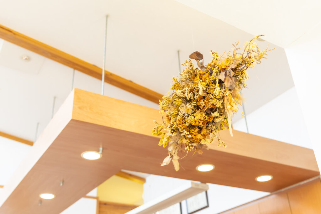 ゆったりとお待ちいただけるように木のぬくもりを生かしてドライフラワーを各所に飾っています。