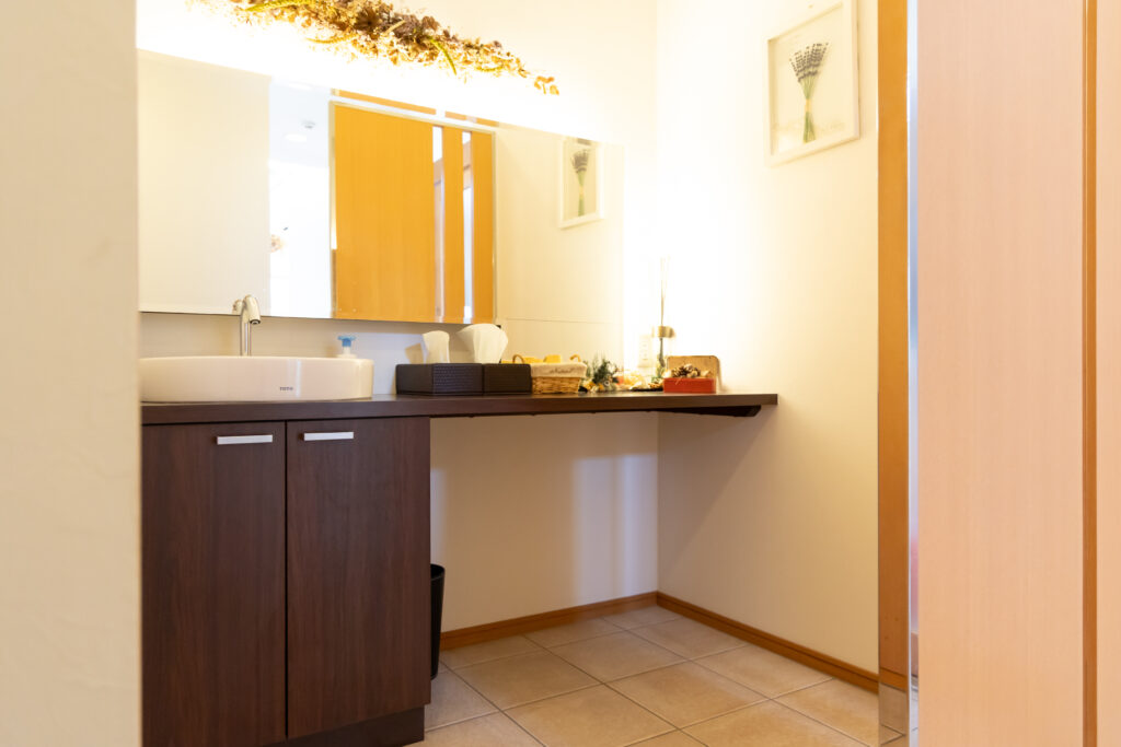 目隠しの衝立があるので待合室からは見えず、大きな鏡でお化粧直しもできます。