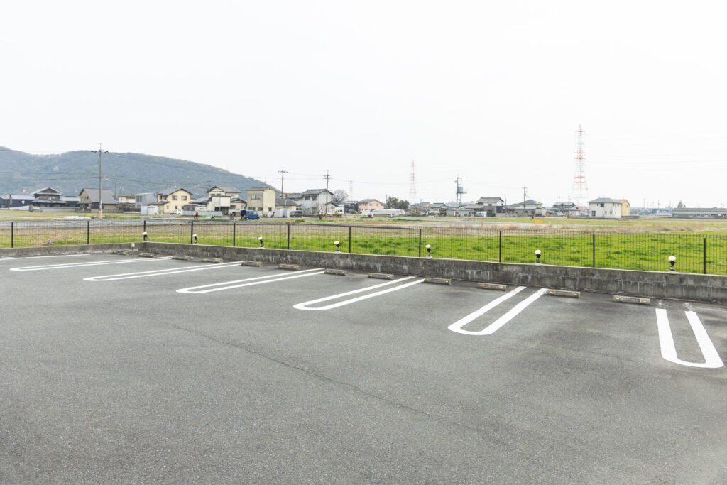 駐車スペースが6台分と、奥に屋根付き駐輪スペースがあります。
